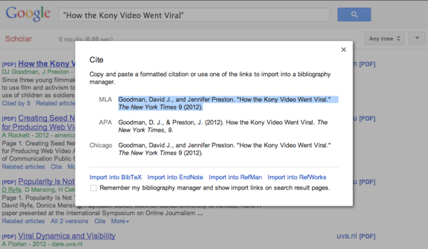 Tip for all my student readers: if you’re too lazy to use a bibliography creator like NoodleBib or RefWorks, let Google generate your bibliography entries for you. All you have to do is google the article/book title in Google Scholar, click “cite” at the bottom of the search result, and copy either the MLA, APA, or Chicago cite into your word document.